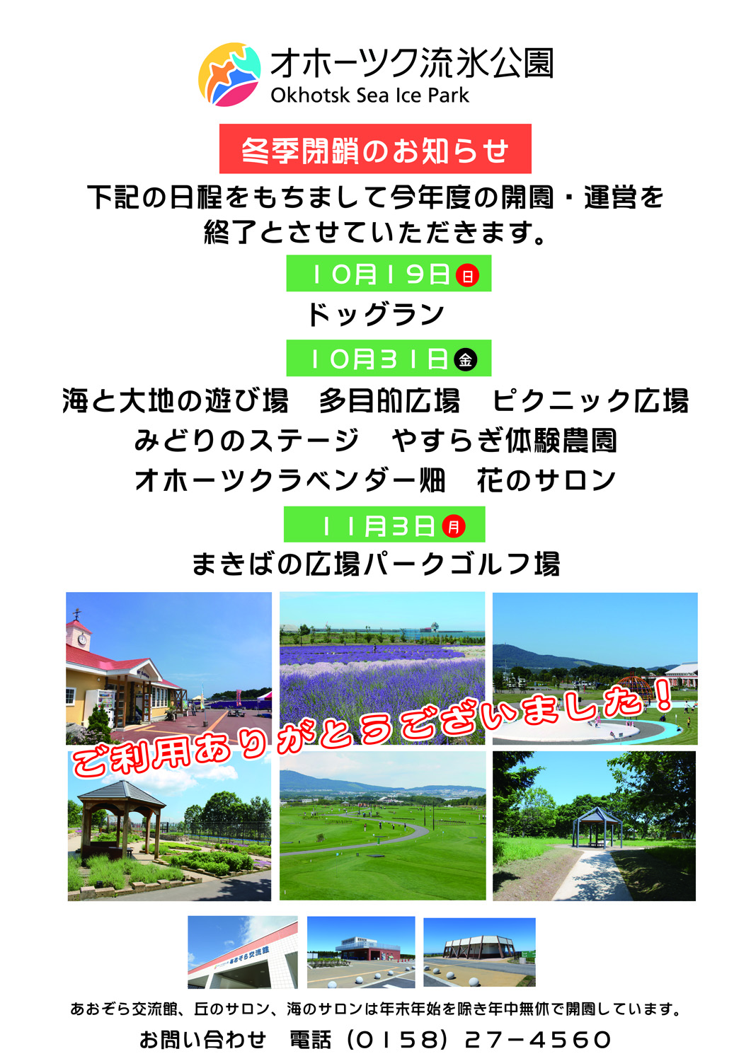 2025.09.25R7.一部施設の「冬季休園」について エリアマップ オホーツク流氷公園の一部施設は10月下旬以降、順次冬季休園となります。 10月19日(日) 〇流氷公園ドッグラン 10月31日(金) 〇海と大地の遊び場 〇ピクニック広場・野外炉・炊事棟 〇多目的広場(バスケットコート他) 〇やすらぎ体験農園 〇オホーツクラベンダー畑 〇花のサロン 11月3日(月・祝) 〇紋別市まきばの広場パークゴルフ場 2026年度の開園は4月下旬を予定しています。 なお、あおぞら交流館及び丘のサロン、海のサロンは年末年始を除き通年で開園しています。 ご不明な点はあおぞら交流館電話(0158)27-4560までお問い合わせください。 全て イベント情報 地域情報 新着情報 月を選択 2025年9月 (13) 2025年8月 (1) 2025年7月 (6) 2025年4月 (6) 2025年2月 (3) 2025年1月 (2) 2024年12月 (4) 2024年11月 (2) 2024年10月 (2) 2024年9月 (3) 2024年8月 (2) 2024年7月 (3)