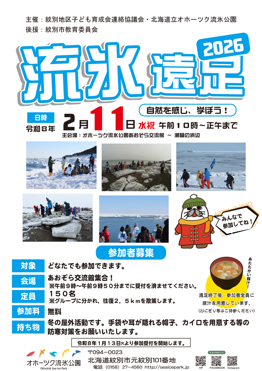 今年で21回目を迎える「流氷遠足」は2月11日(水・祝)にオホーツク流氷公園で開催されます。流氷や冬の自然と触れ合い自然環境の大切さやオホーツク地域の素晴らしさを感じてもらう体験事業。皆様のご参加をお待ちしております。