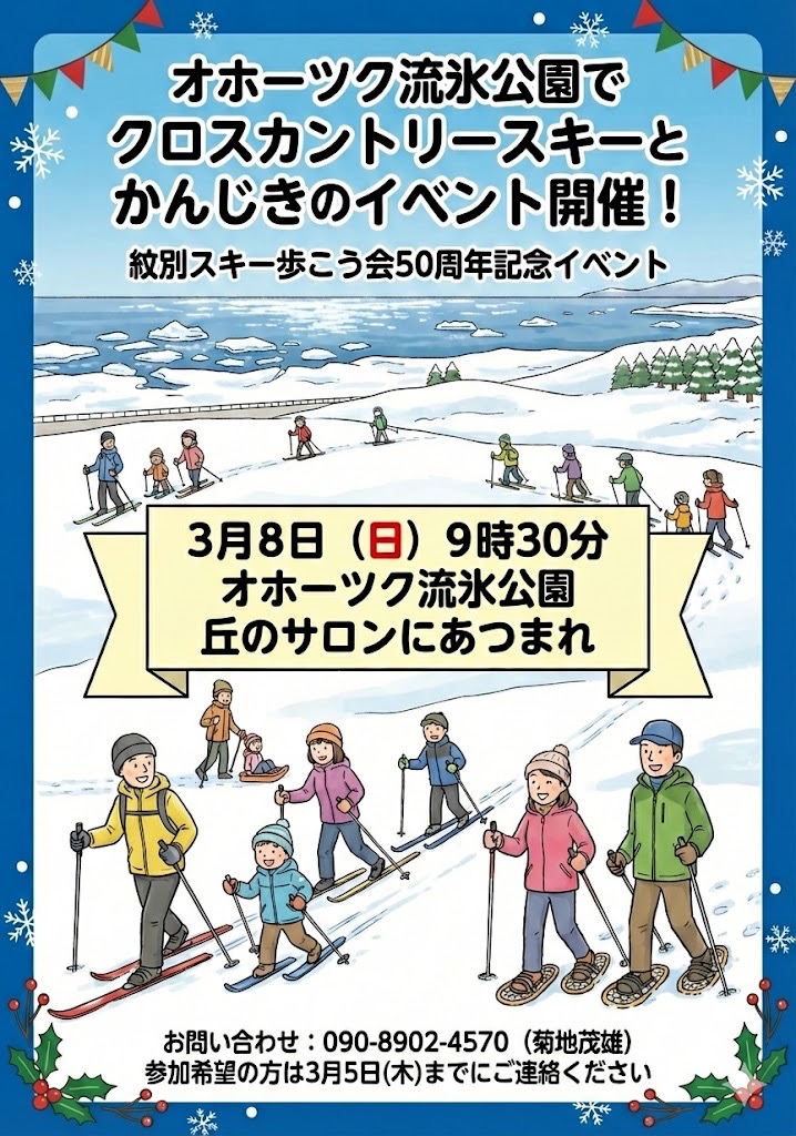 2026.02.14R8.3.8 紋別スキー歩こう会50周年事業 エリアマップ オホーツク流氷公園C-2ブロックを会場に紋別スキー歩こう会50周年事業として3月8日(日)にクロスカントリースキーとスノーシューを活用したイベントが開催されます。 初心者の方には同会の会員が手ほどきもしてくれます。 参加は無料(用具も貸し出し)。 対象は小学生から高齢者まで幅広く募集し、当日はみんなで楽しむ企画も用意しています。 参加締め切りは3月5日(木)まで。 参加は同会の菊池さん 携帯090(8902)4570 全て イベント情報 地域情報 新着情報 月を選択 2026年2月 (7) 2026年1月 (2) 2025年12月 (4) 2025年11月 (1) 2025年10月 (1) 2025年9月 (5) 2025年8月 (1) 2025年7月 (6) 2025年5月 (2) 2025年4月 (6) 2025年2月 (1) 2025年1月 (2)