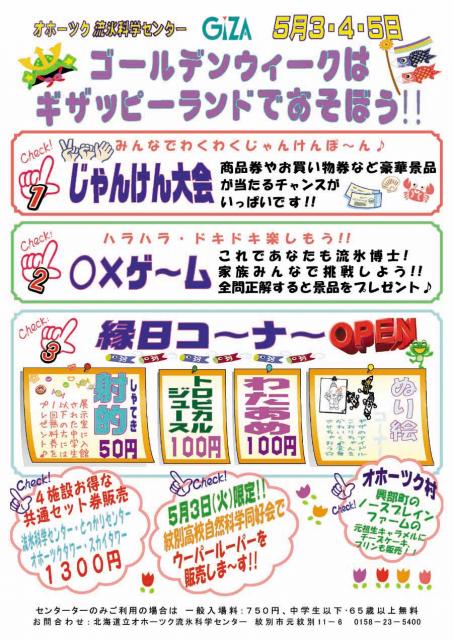 流氷公園と同じ、道立施設のオホーツク流氷科学センターGIZAでは、「ゴールデンウイークはギザッピーランドであそぼう!!」と銘打ち、「じゃんけん大会」や「○×ゲーム」などのイベントのほか、縁日コーナーも開設されます。