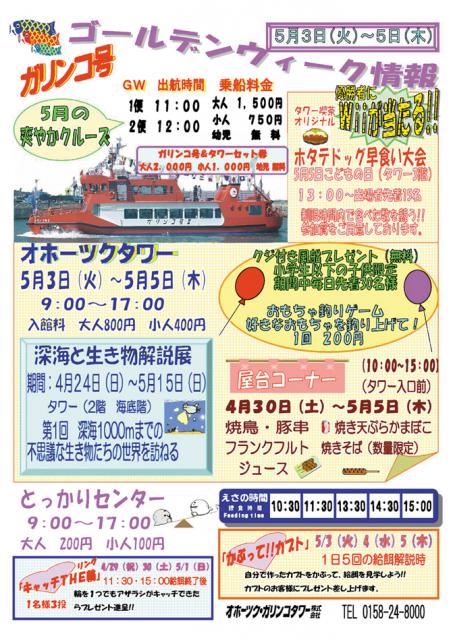 オホーツク流氷公園がある紋別市内の観光施設で、5月3日(火)~5日(木)までゴールデンウイークイベントが開催されます。