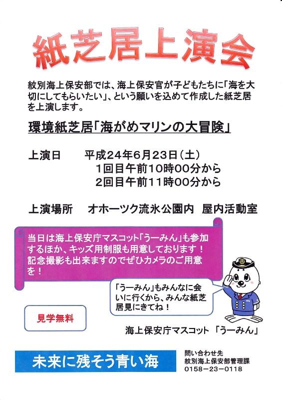 2012.06.2223日はうーみんと遊ぼう! エリアマップ 紋別海上保安部では、海上保安官が子供たちに「海を大切にしてもらいたい」という願いを込めて作成した紙芝居を6月23日午前10時と午前11時にオホーツク流氷公園内あおぞら交流館で開催します。 環境紙芝居「海がめマリンの大冒険」を上映します。 当日は海上保安庁のマスコット「うーみん」も参加するほか、キッズ用制服も用意しています。記念撮影もできるので是非、ご来場ください。 全て イベント情報 地域情報 新着情報 月を選択 2025年9月 (13) 2025年8月 (1) 2025年7月 (6) 2025年4月 (6) 2025年2月 (3) 2025年1月 (2) 2024年12月 (4) 2024年11月 (2) 2024年10月 (2) 2024年9月 (3) 2024年8月 (2) 2024年7月 (3)