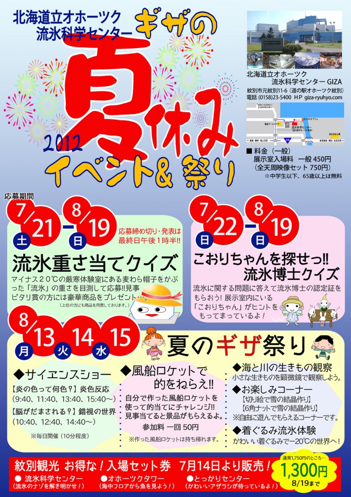 2012.07.15ギザの夏休みイベント開催中 エリアマップ 道立オホーツク流氷科学センターギザで8月19日まで「ギザの夏休みイベント&祭り」が開催されています。 イベントの詳細はポスターをご参照ください! 全て イベント情報 地域情報 新着情報 月を選択 2025年9月 (13) 2025年8月 (1) 2025年7月 (6) 2025年4月 (6) 2025年2月 (3) 2025年1月 (2) 2024年12月 (4) 2024年11月 (2) 2024年10月 (2) 2024年9月 (3) 2024年8月 (2) 2024年7月 (3)