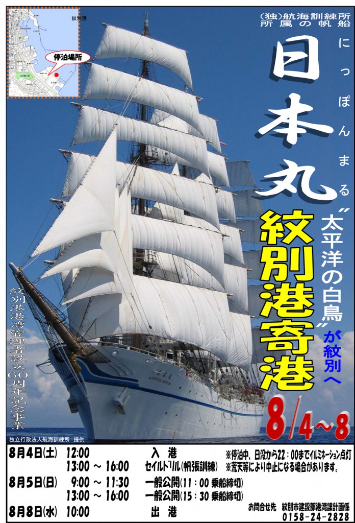 独立行政法人航海訓練所練習船帆船「日本丸」が8月4日(土) 紋別港港南岸壁に入港します。