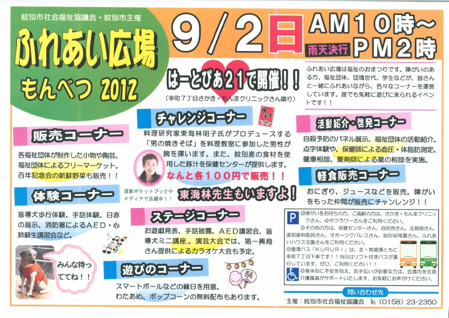 紋別市社会福祉協議会と紋別市主催の「ふれあい広場もんべつ2012」が9月2日(日)午前10時よりはーとぴあ21で開かれます。