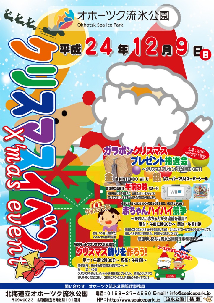 オホーツク流氷公園では12月9日(日)午前9時より「クリスマスイベント」をあおぞら交流館で開催します。