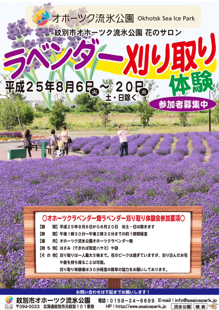エリアマップ見頃が過ぎつつあるオホーツクラベンダー畑にて8月6日より土・日を除く20日まで「ラベンダー刈り取り体験」を開催。広く参加者を募集しています。