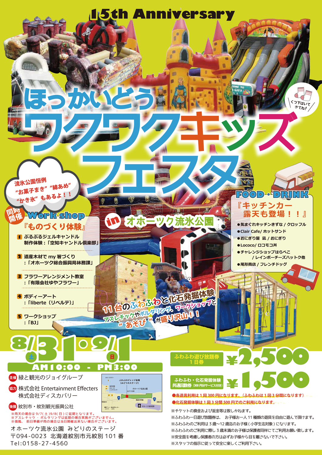 エリアマップオホーツク流氷公園開園15周年記念として「ほっかいどうワクワクフェスタ」を8月31日(土)~9月1日(日)午前10時~午後3時まで開催します。